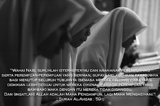 “Hai Nabi katakanlah kepada istri-istrimu, anak-anak perempuanmu dan istri-istri orang mumin : “Hendaklah mereka mengulurkann jilbabnya ke seluruh tubuh mereka.” (QS. Al Ahzab : 59)